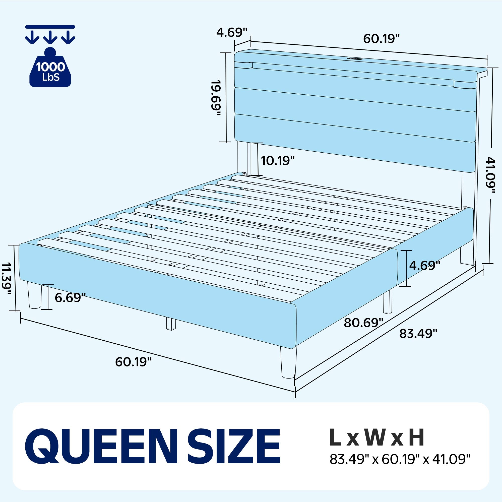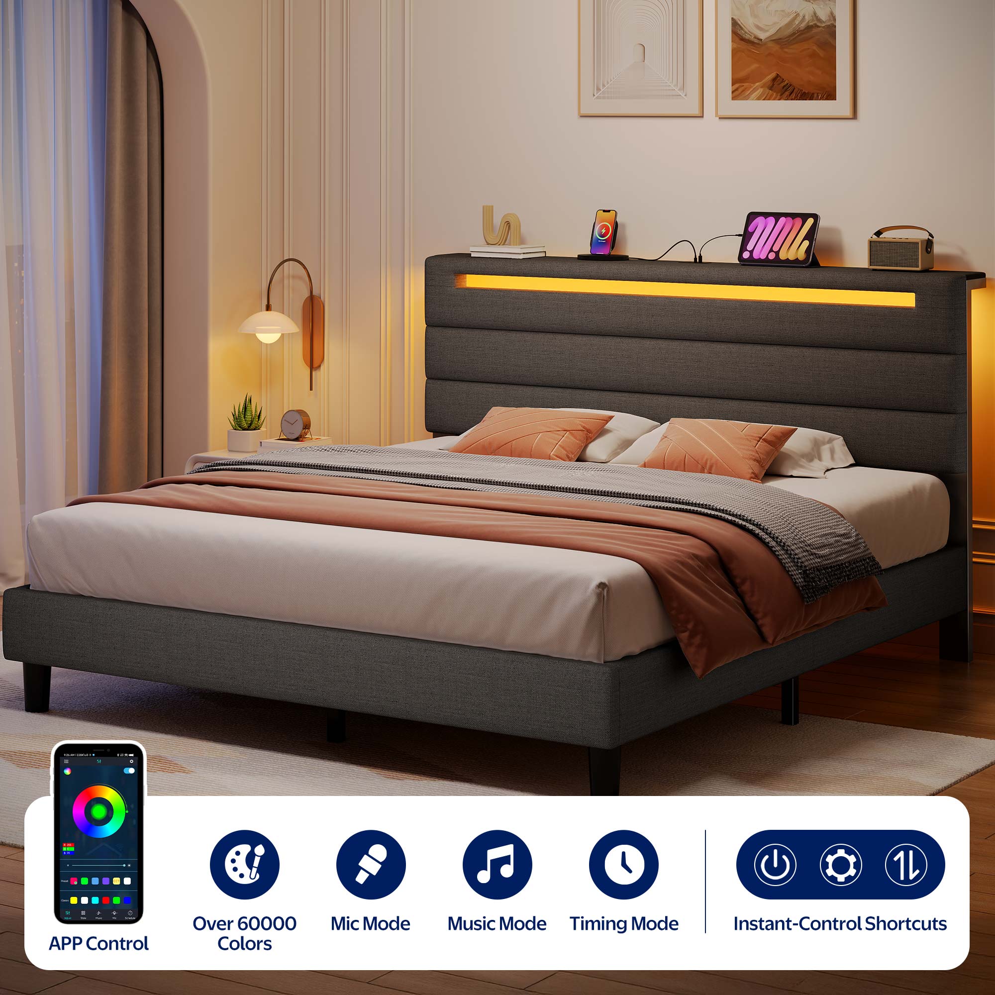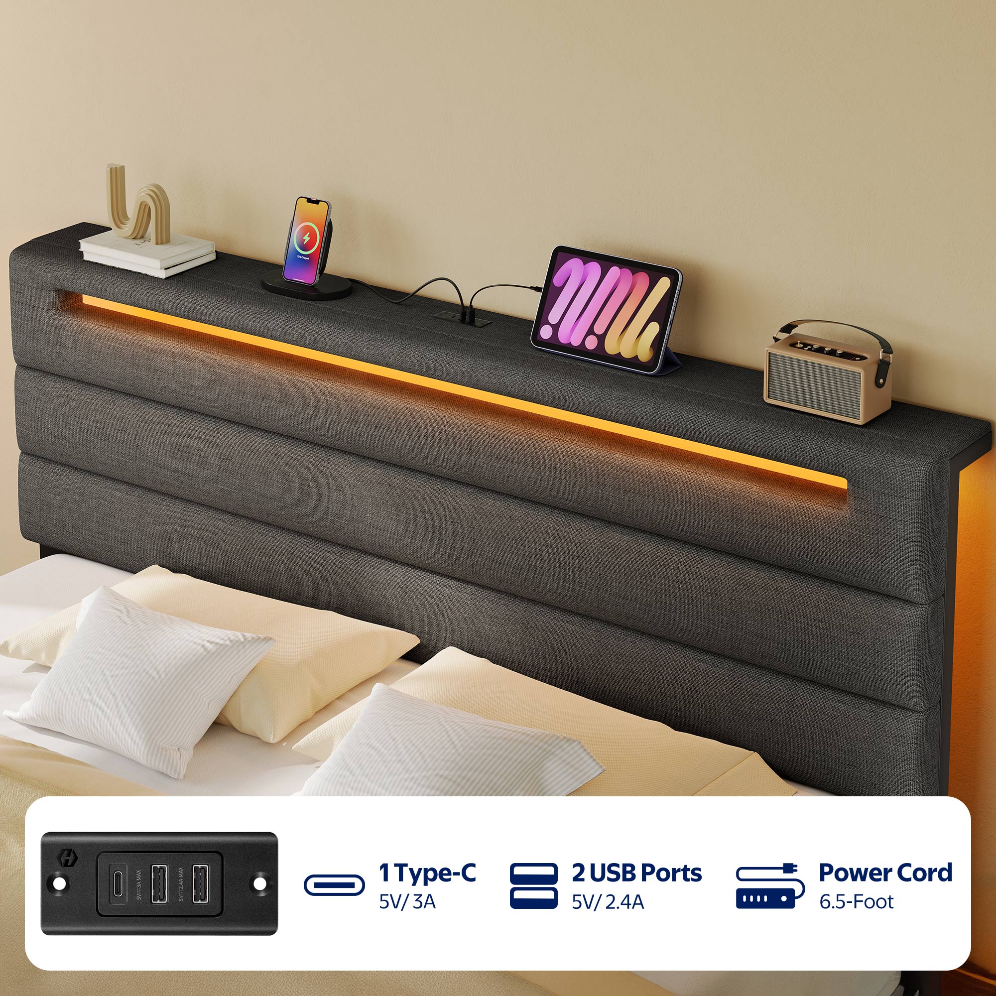 Greenstell Queen Size Bed Frame with Upholstered Storage Headboard and LED Light, Bed Platform with Charging Station, USB Ports, Under-bed Storage, Dark Gray