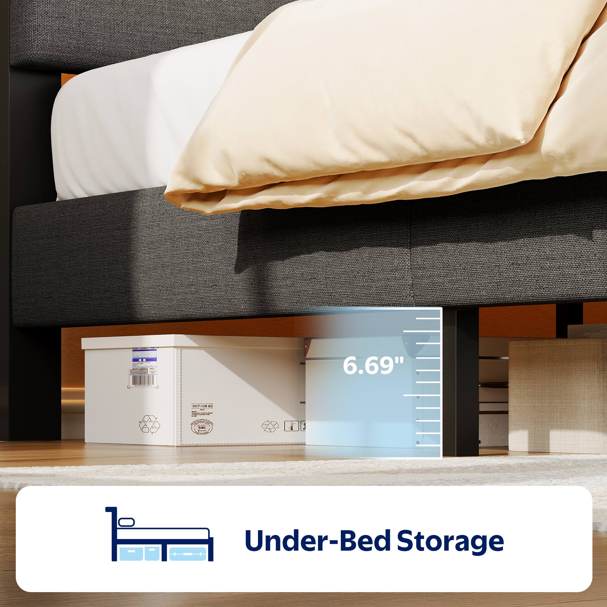 The headboard shelf keeps small items like books, glasses, or décor within reach, while the under-bed clearance provides extra space for storage bins or boxes to keep your room tidy.