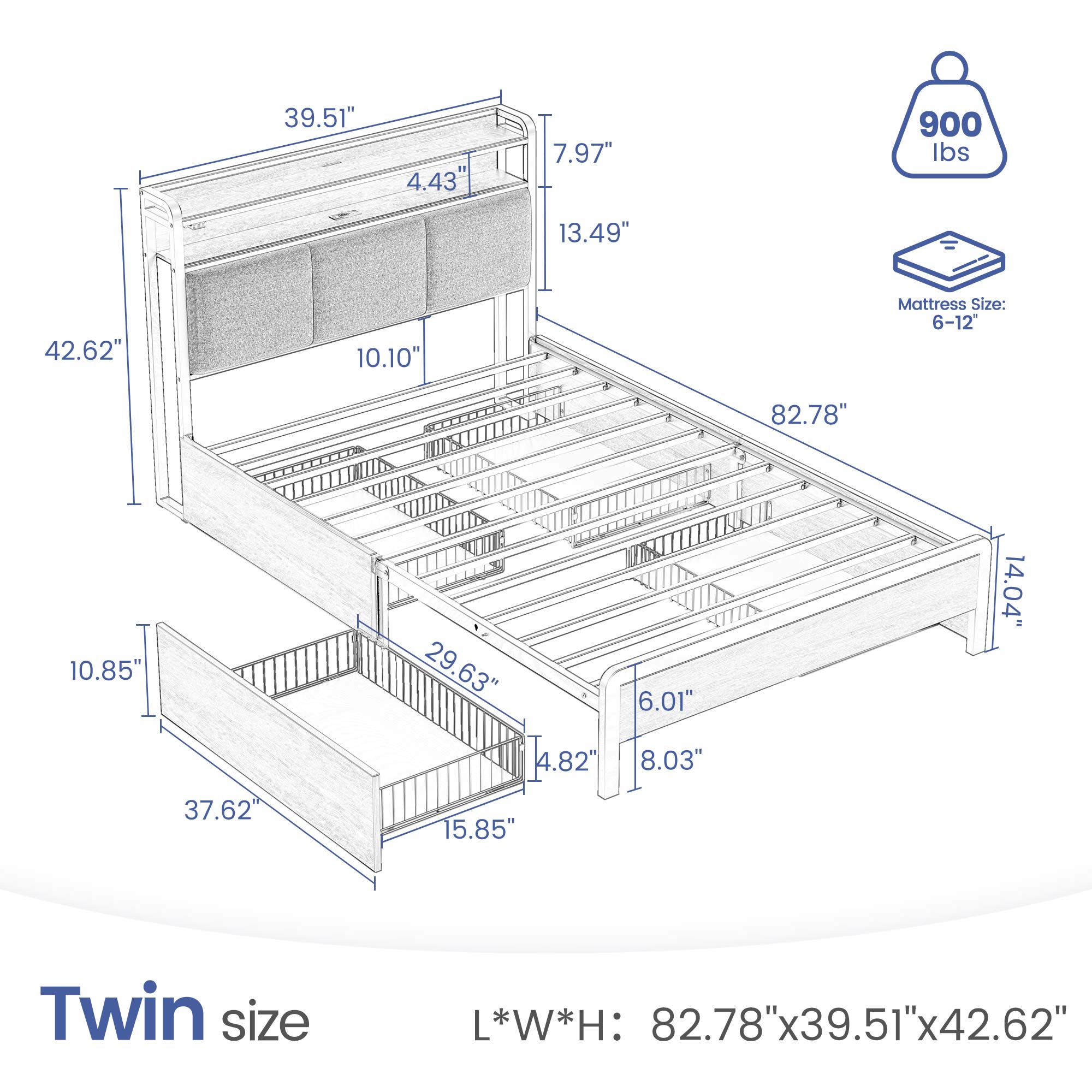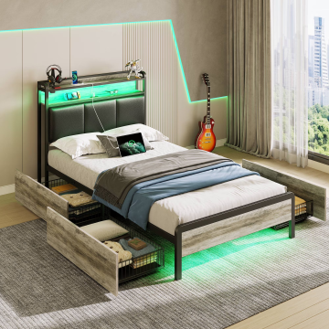 Experience the ultimate in convenience and style with this upholstered twin bed frame, featuring exceptional storage capacity, a built-in charging station, and dynamic RGB LED lighting. The headboard is upholstered in high-quality leather with a soft, skin-friendly backrest - ideal for kids beds for boys. Its 2-layer storage shelf keeps phones and glasses within reach, while 4 under-bed drawers (perfect for twin bed with storage needs) maximize bedroom organization. Both ends of this twin size bed frame feature RGB light strips with 12 color modes. The built-in charging station (2 USB + 1 Type-C) makes it a bed twin tech hub. Supported by steel frame construction that holds 900lbs, this quiet twin bedframe ensures stability for twin beds for kids or adult use. Elevate your space with this multi-functional twin bed with drawers - where style meets smart living.